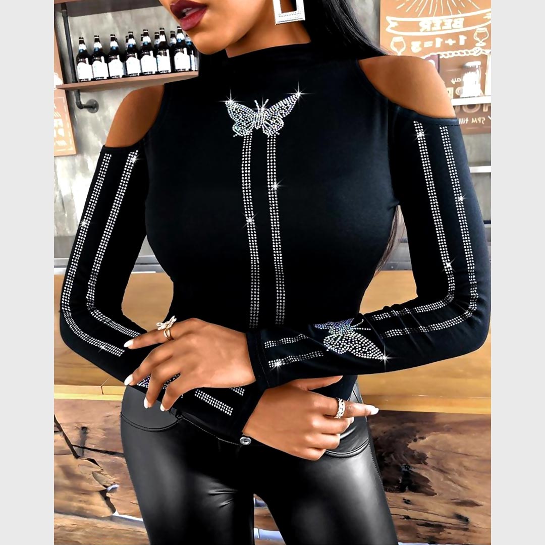 Cut-Out Shoulder Butterfly Studded TopCut-out Shoulder Butterfly Pattern Studded Top