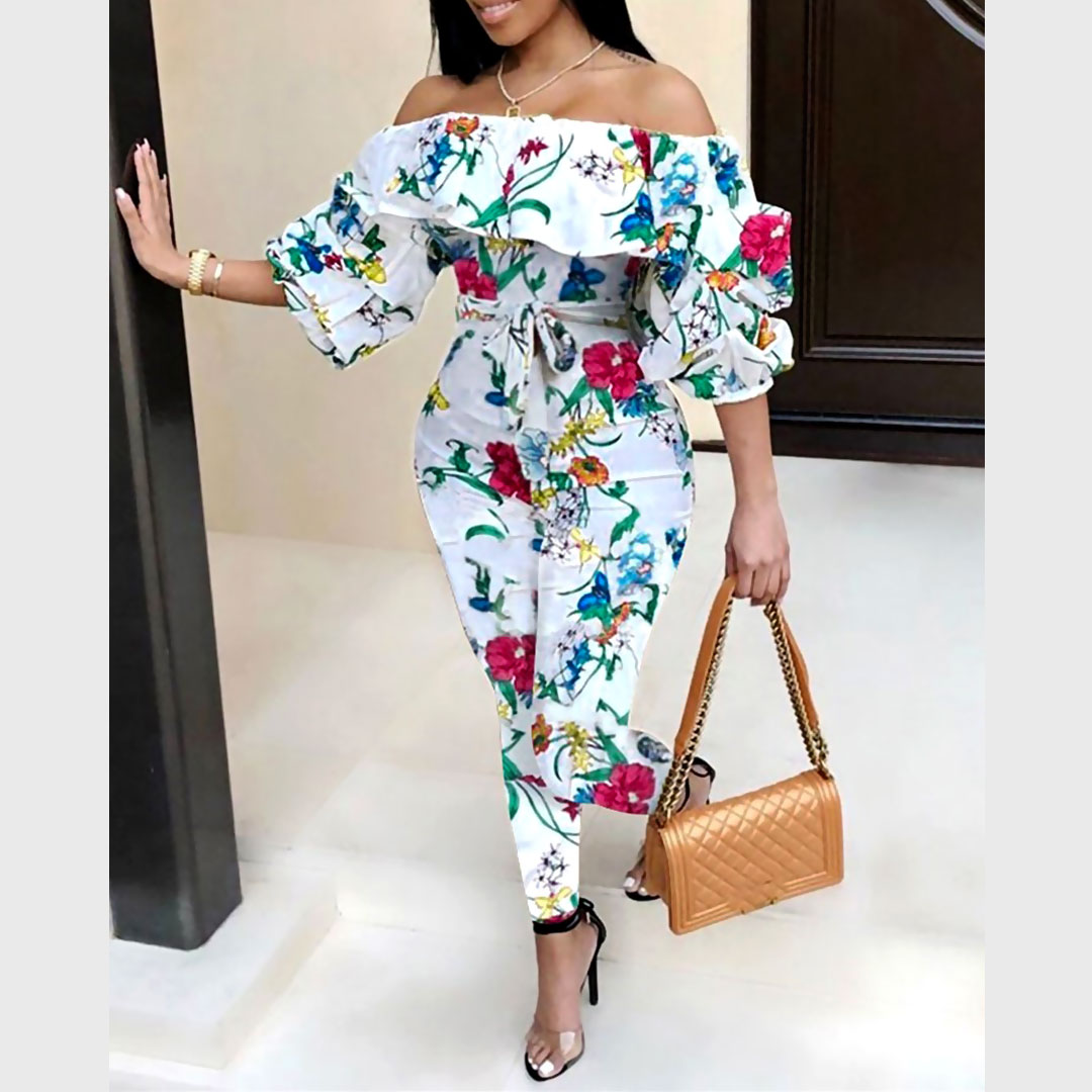 Floral Lantern JumpsuitOff Shoulder Floral Print Lantern Sleeve Jumpsuit