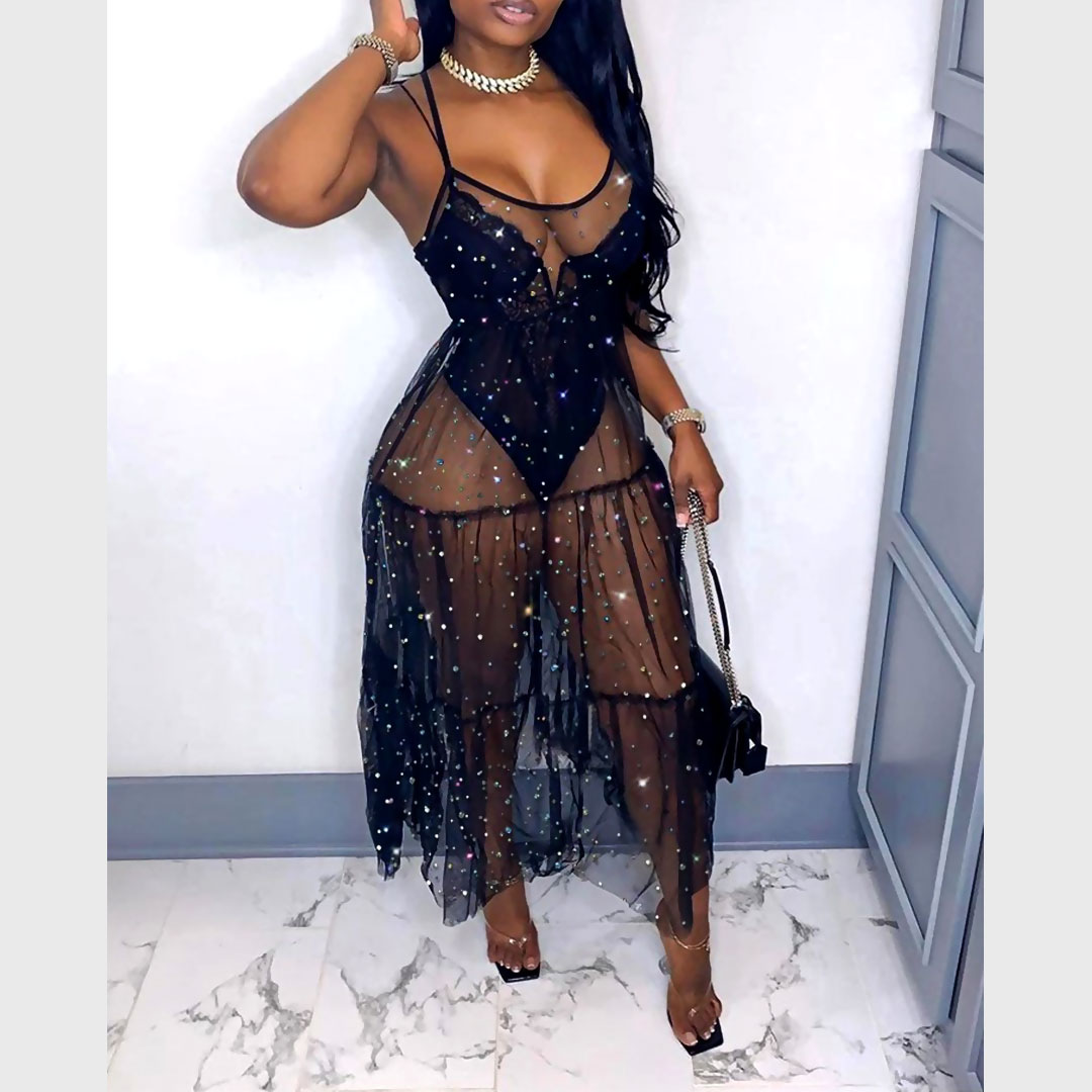 Mesh Studded Maxi DressMesh Studded See Through Large Bottom Maxi Dress