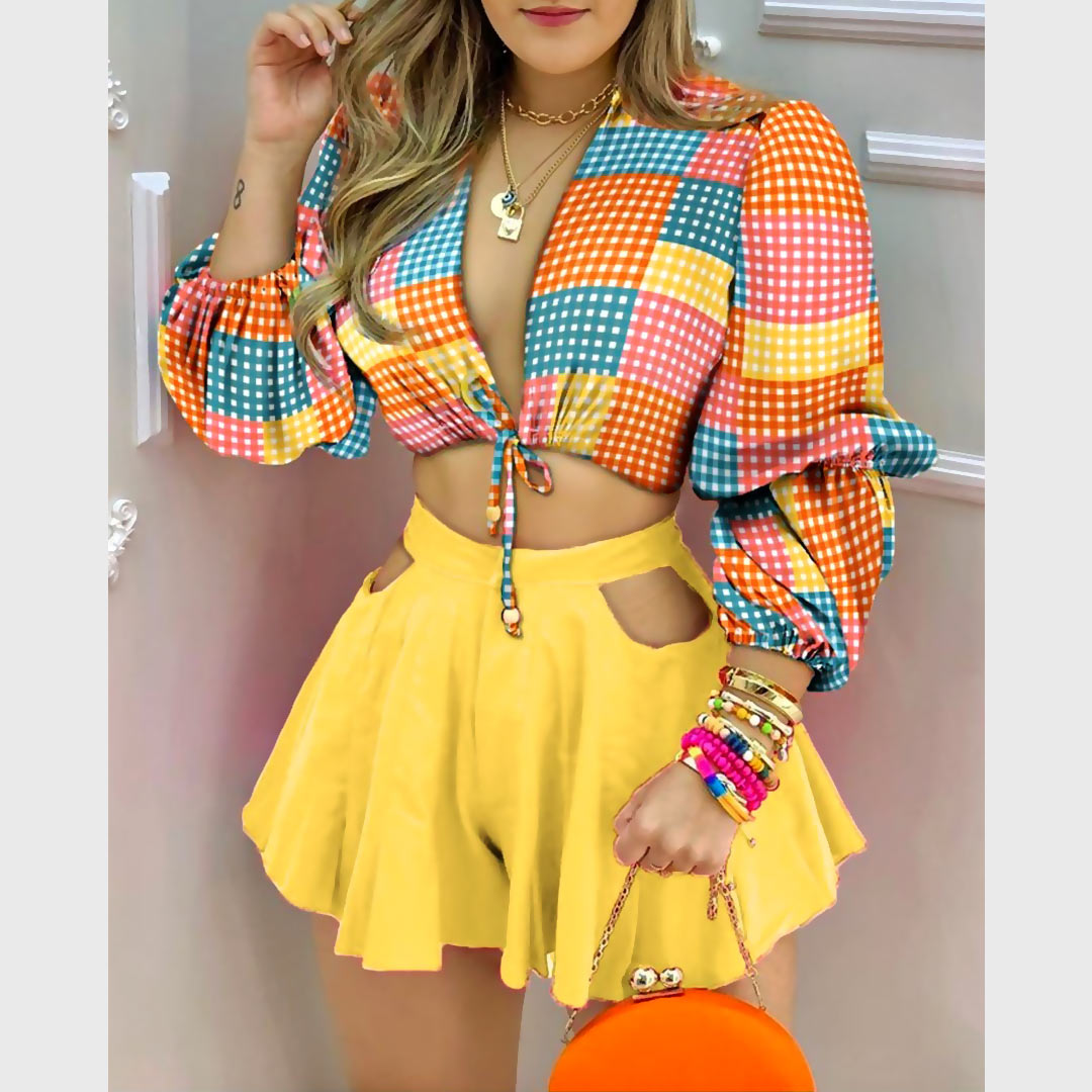 Plaid Lantern Sleeve Crop Top Cut-Out Shorts Set
