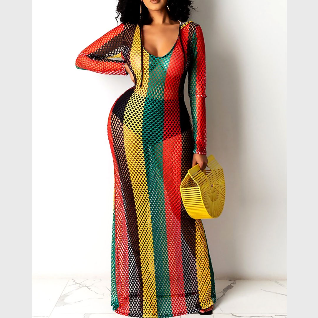 Rasta Colour Block Hollow Out Hooded Cover Up Dress